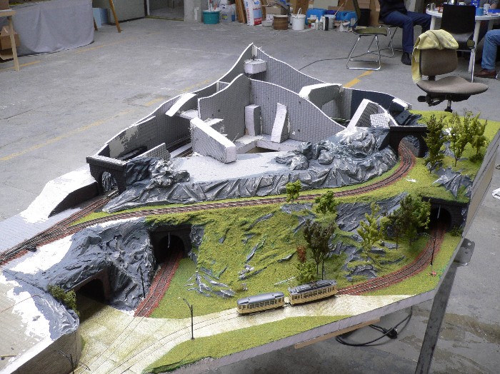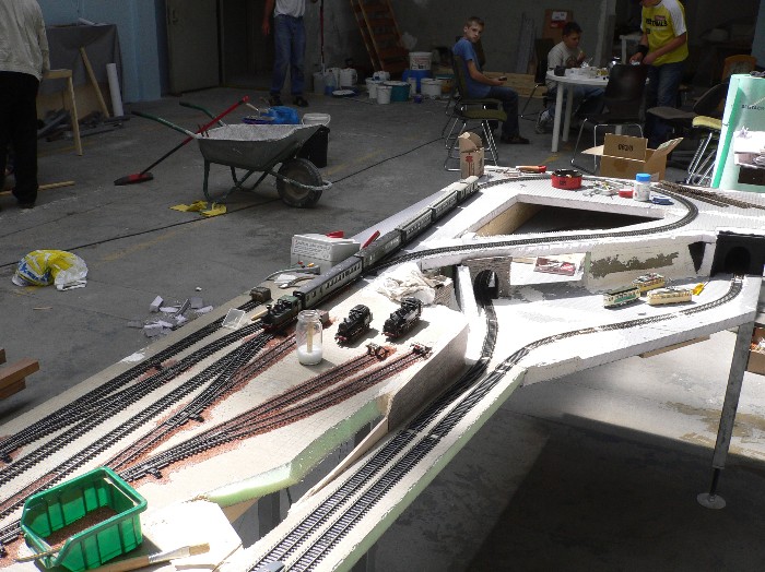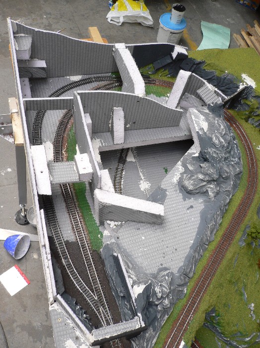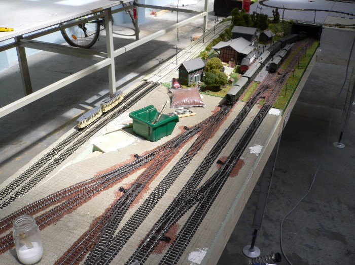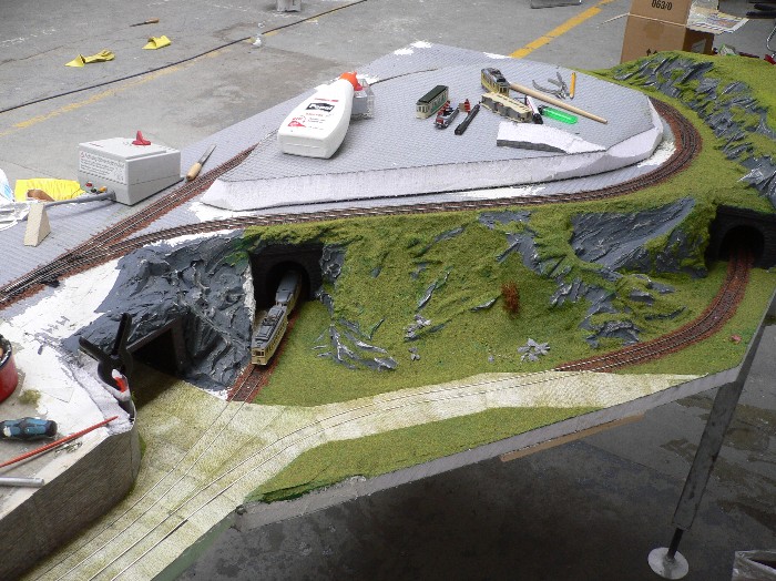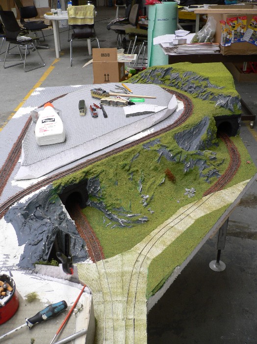 Hier hat Holger die beiden Kehrschleifenmodule weitergebaut und er ist Gipsspezialist. Also habe ich ihn mal machen lassen. Und er hat dann auch gleich diesen mit matter grüner Ölfarbe bestrichen und darauf mit dem Sieb Grasfaserrn gestreut. In ein paar Wochen, wenn ich wieder Zeit zum Basteln habe, werde ich hier und da mit der Leberwurstmethode nacharbeiten.