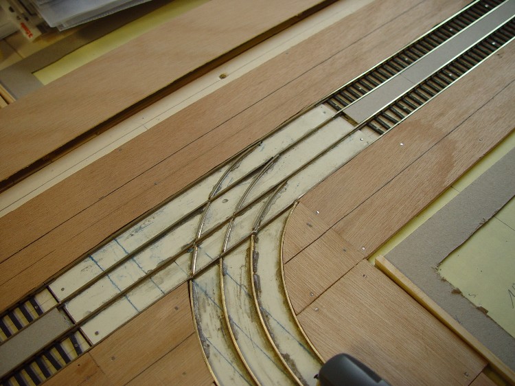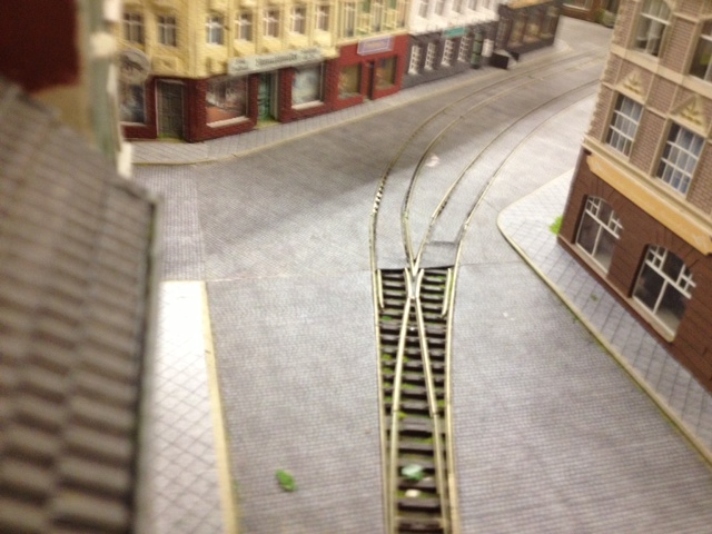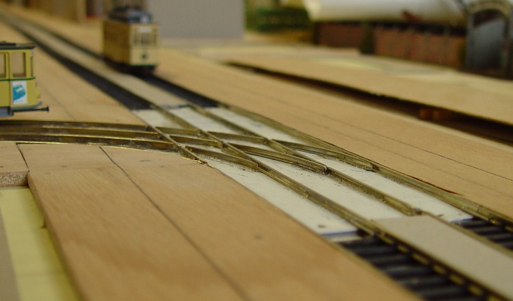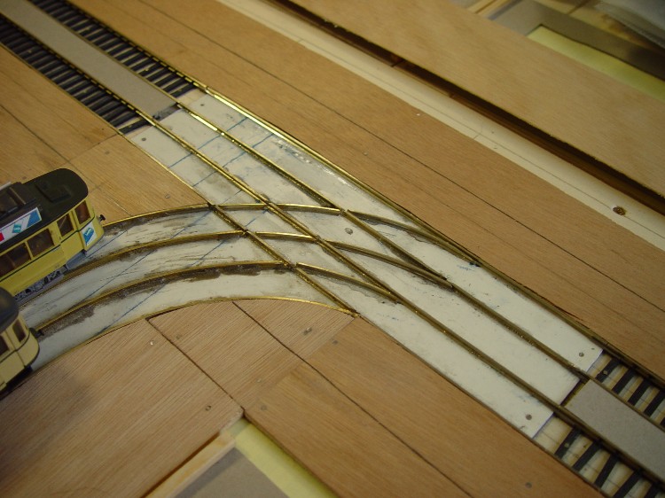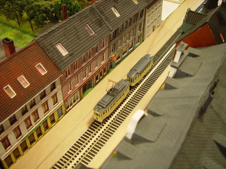 Erst mal ging es so weiter,doch dann haben wir überlegt, daß ein kleiner Schattenbahnhof in einer Kehrschleife nicht schlecht wäre. Die Straßenbahngleise bauen wir auf unserer Wuppertalachsenanlage so ein: Schöne Grüße