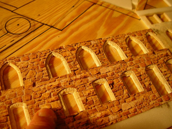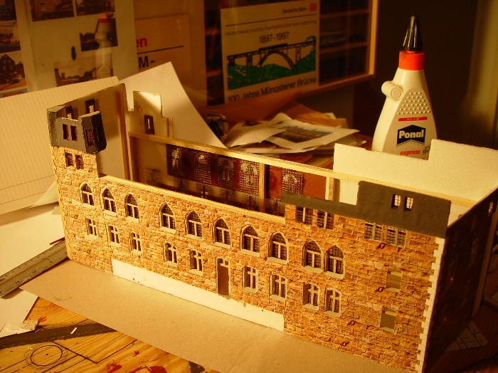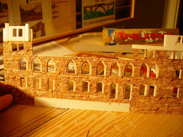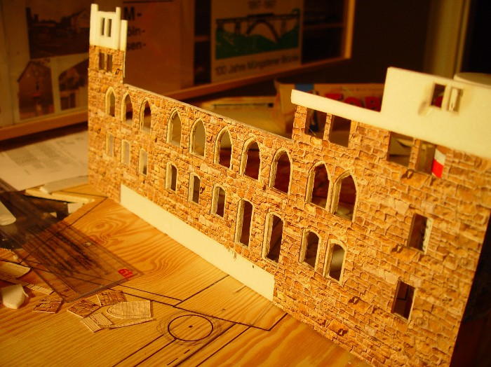 Ich werde deshalb alle Fenster im Eigenbau in möglichst richtigen Proportionen erstellen. Nur bei der Außenfassade mache ich es mir wesentlich einfacher: Vollmer bietet aus Pappe Bruchsteinmauerplatten mit Reliefprägung an (HO 6036), die ziemlich genau dem Vorbild von Schloß Burg in Struktur und Farbe entsprechen.