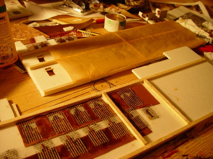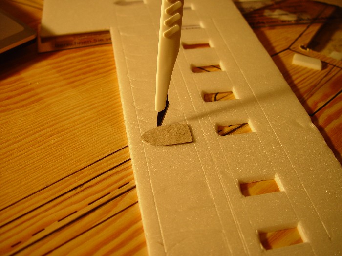 Die Rahmen-, Balken-, Quer- und Mittelstreben der Fenster werden je nach Größe gleich aus dem Depron herausgeschnitten, aus Pappe hinterklebt oder aus Holzleistchen eingefügt.