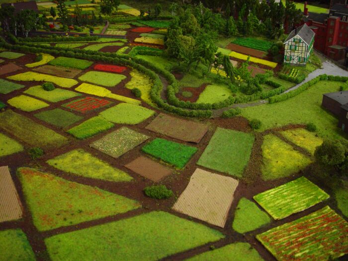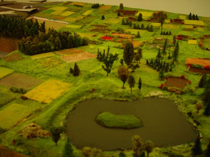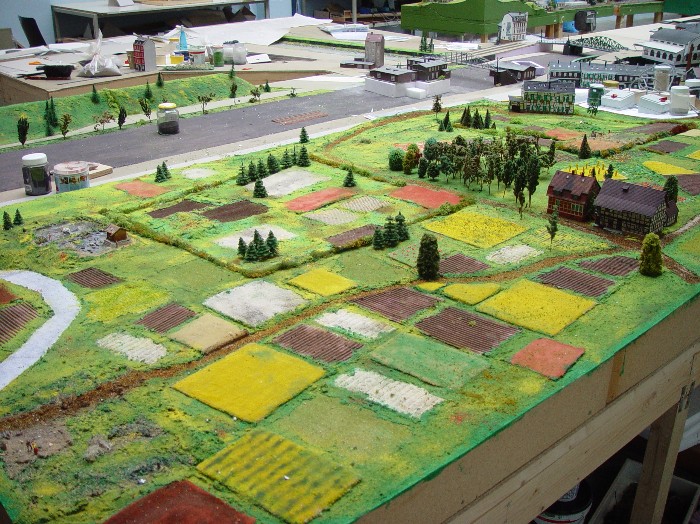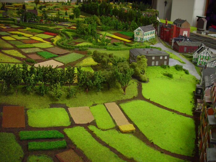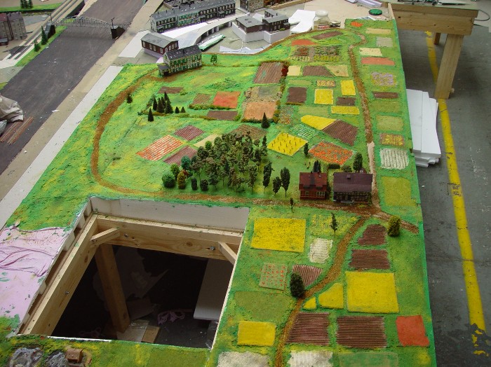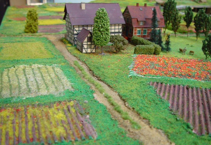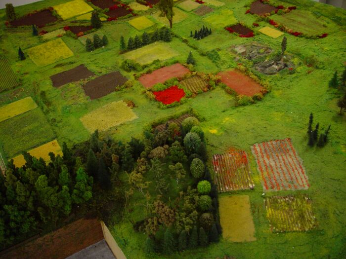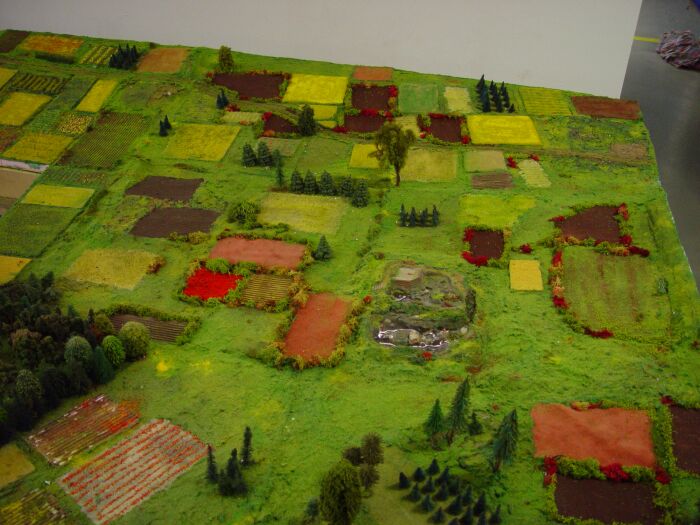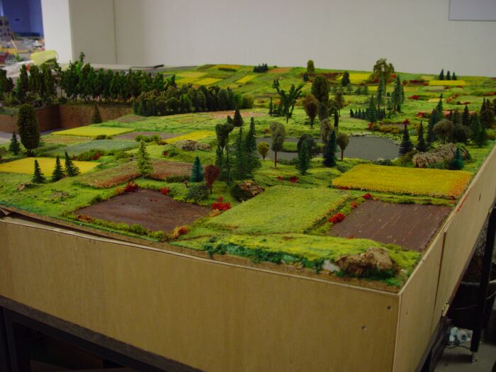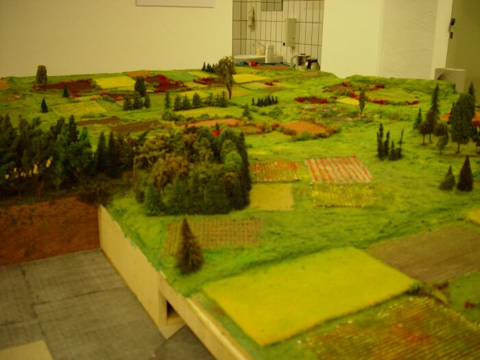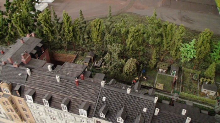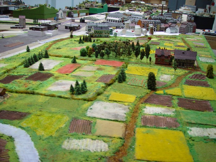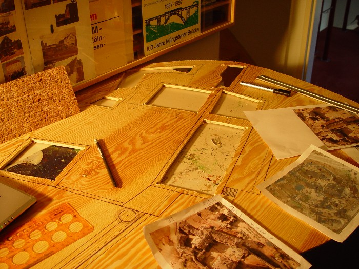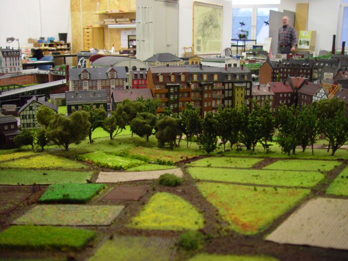 Dabei wird im Maßstab 1:100 das Modell 130 mal 90 cm groß. Die Höhenangaben der Gebäude habe ich dann aus Fotos ungefähr errechnet bzw. geschätzt.