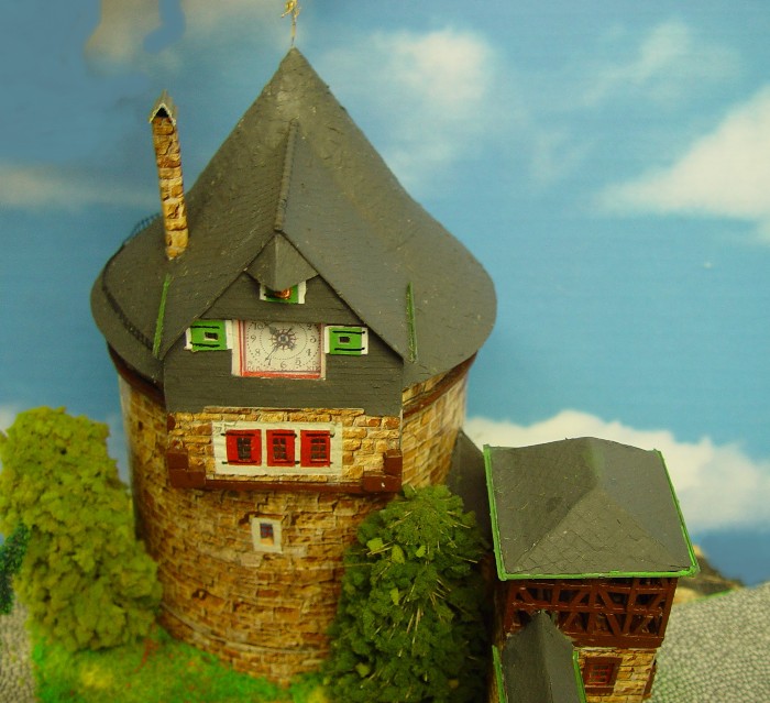 Dann wurde der Rundturm mit Uhr und Schiefererkeranbau gebaut. Das ganze Ensemble sieht dann vorläufig so aus: