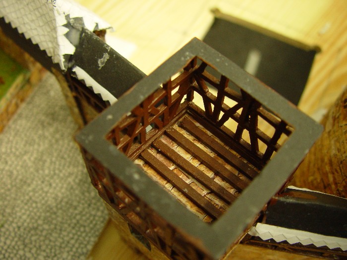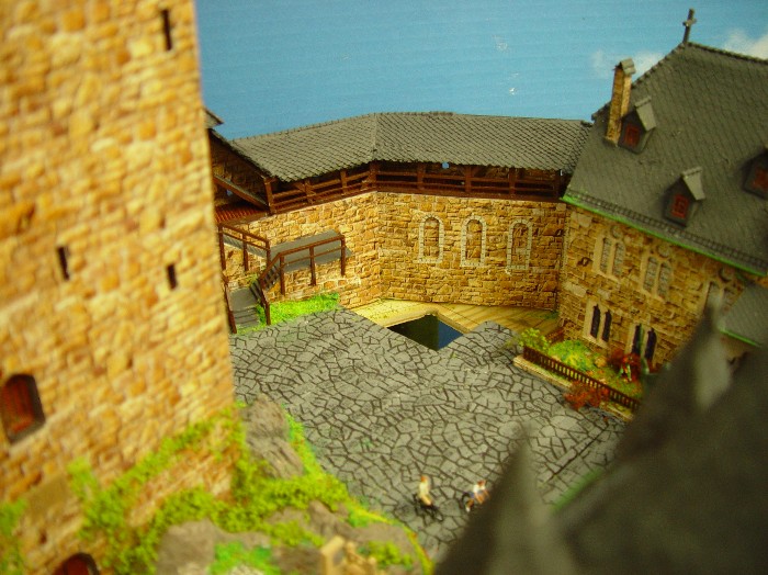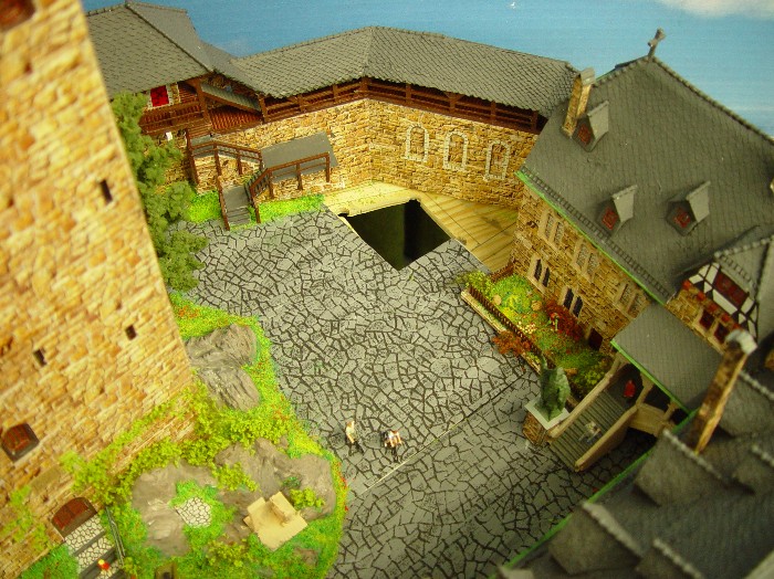 Jetzt habe ich den letzten Wehrgang, der mit den anderen in weiten Bögen um den Bergfried herum führt. Das Loch ist die "Baugrube" für ein noch zu erstellendes Haus: