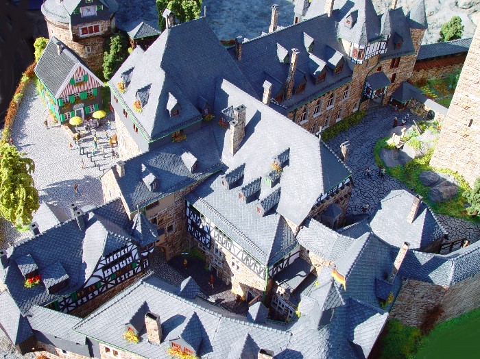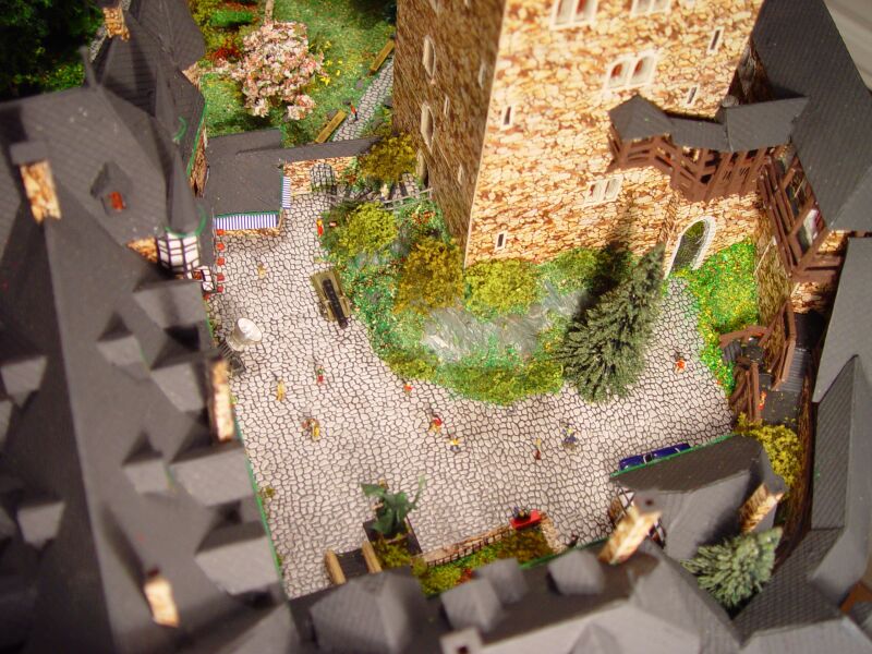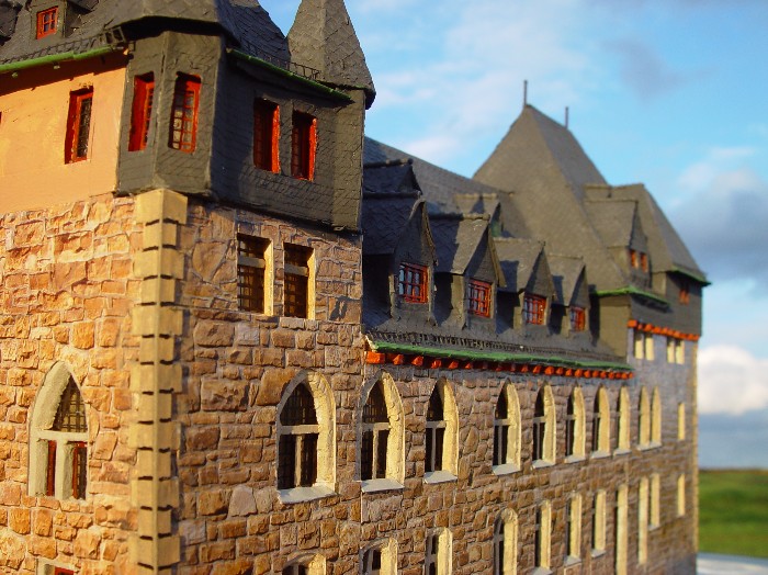 Weil in dem Modell der Eisenbahnfreude der Burghof mit Bergfried also ca 10 cm zu niedrig ist, hat auch der Bergfried nicht die richtige Höhe und schaut nur etwas über das Haupthaus hinaus.
