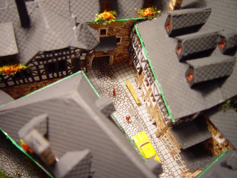 Die Dächer sind zum Abschluß noch mit hellerer grauer Farbe leicht mit dem fast trockenen Pinsel überstrichen worden. Dadurch kommen die Dachschindelstrukturen besser raus: