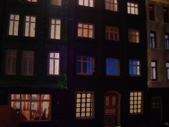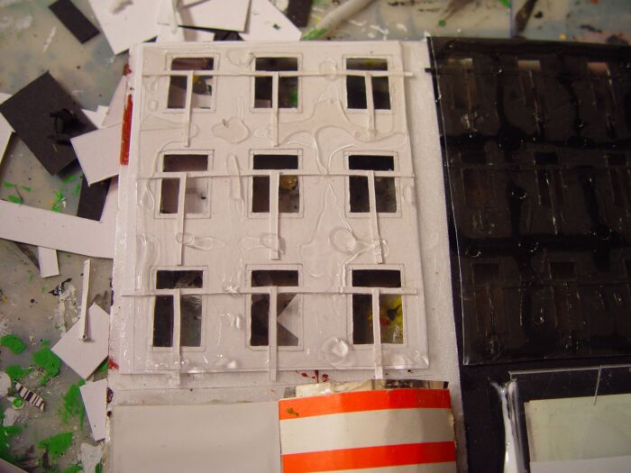 Hier sind die Gardinen (aus dem Internet Gardinenangebote ausdrucken) schon aufgeklebt und da ja nicht alle Fenster erleuchtet sein müssen werden einige mit schwarzem Karton abgedeckt: