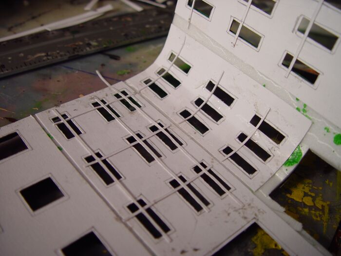 Nun werden auf der Rückseite die Fenstersprossen aus dünnen Kartonstreifen hinterklebt: