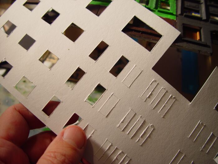 Die Fensterrahmen werden aus weißem oder schwarzem Karton mit dem scharfen Messer herausgeschnitten: