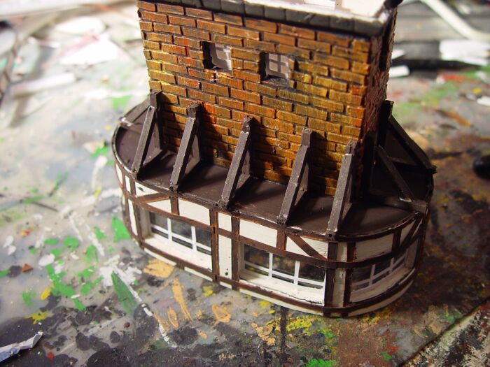 Nach Einfügen der Fenster und Türen wird der Unterbau an den Oberbau geklebt und jetzt beginnt das Stützenfachwerk aus 3mm Holzleisten: