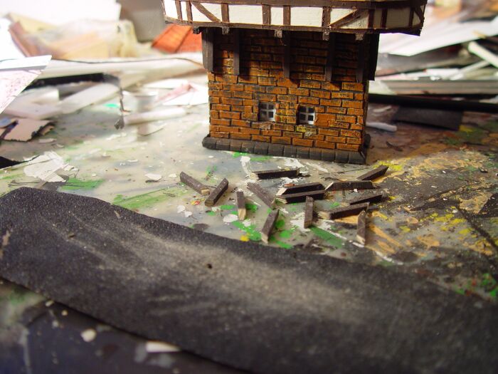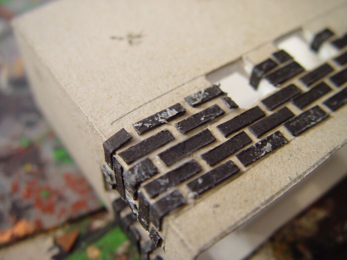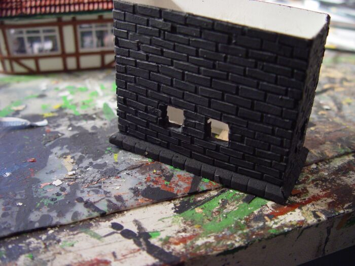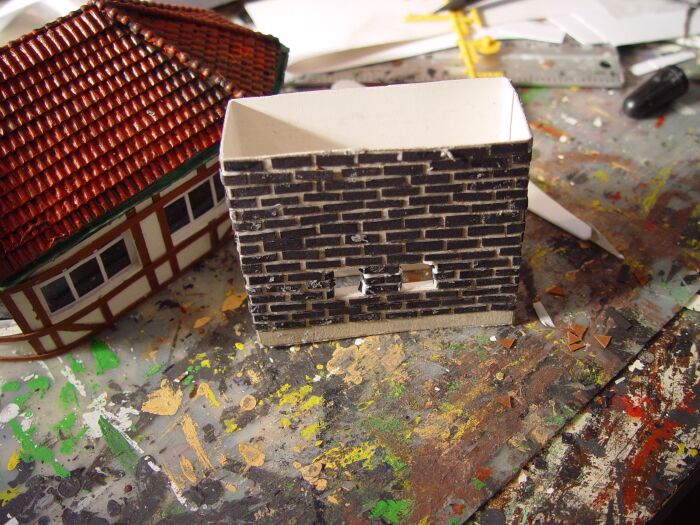 Auf die Hauswände werden jetzt mit Ponal-express Papprechtecke aufgeklebt, wobei erst der Leim eine ganze Steinreihe aufgestrichen wird und dann schnell die Pappstückchen aufgeklebt werden. Dabei steht anfangs relativ viel Leim über und es sieht wie auf dieem Foto nach einer ziemlichen Sauerei aus. Aber Geduld, das wird später noch gestrichen und dann verschwinden alle Leimüberstände.
