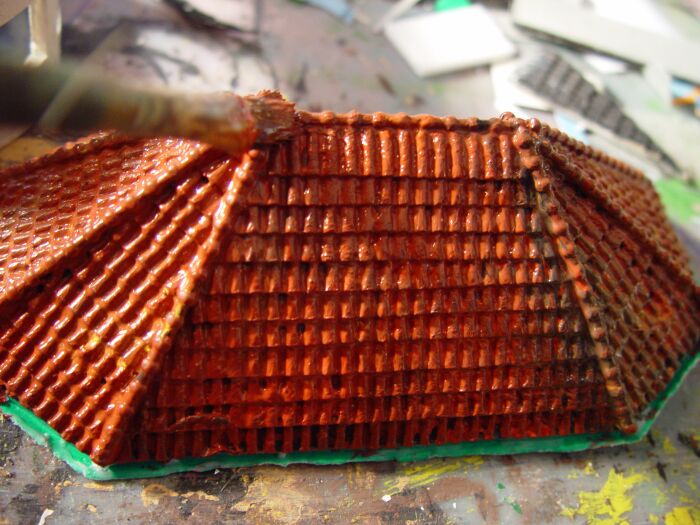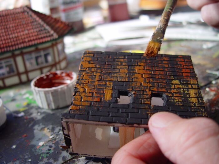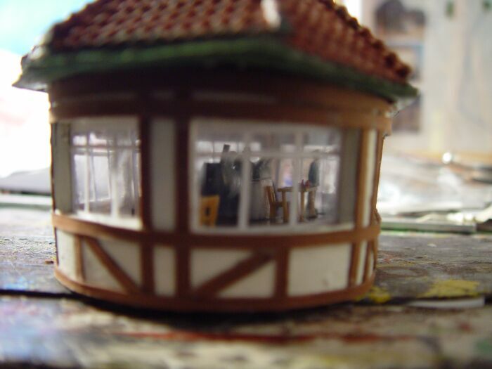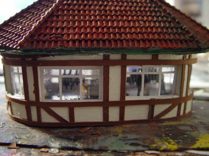 Und nun, nachdem ich noch ein wenig an den Dachrinnen herumgebogen , einen Kamin aufgesetzt, hier und da nachcoloriert und etwas Hekiflor angeklebt habe, wird das Ganze umgedreht und probehalber auf meine Anlage gestellt:
