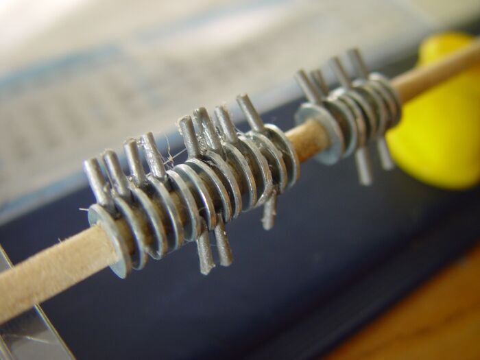 Die Stellwerkshebel bestehen aus kleinen Unterlegscheiben, die auf einen runden Holzstab aufgezogen sind und dazwischen werden die Griffhebel aus Bausatzresten angebracht.