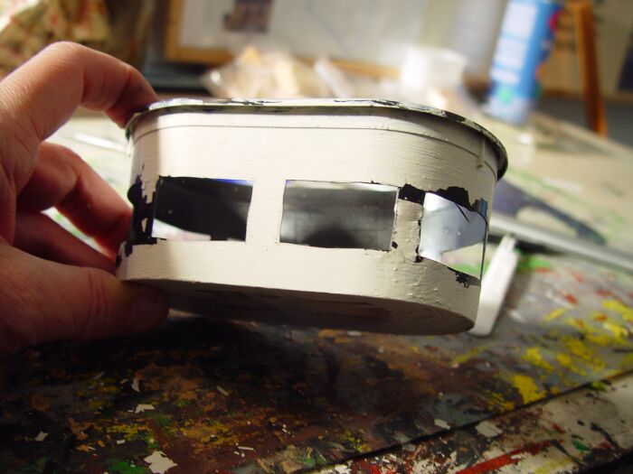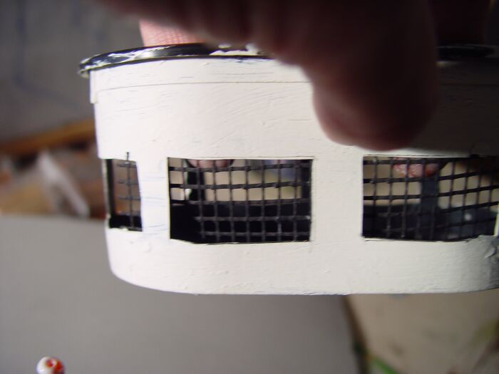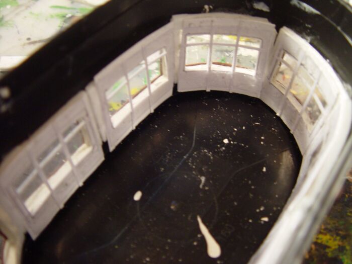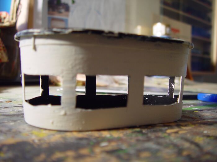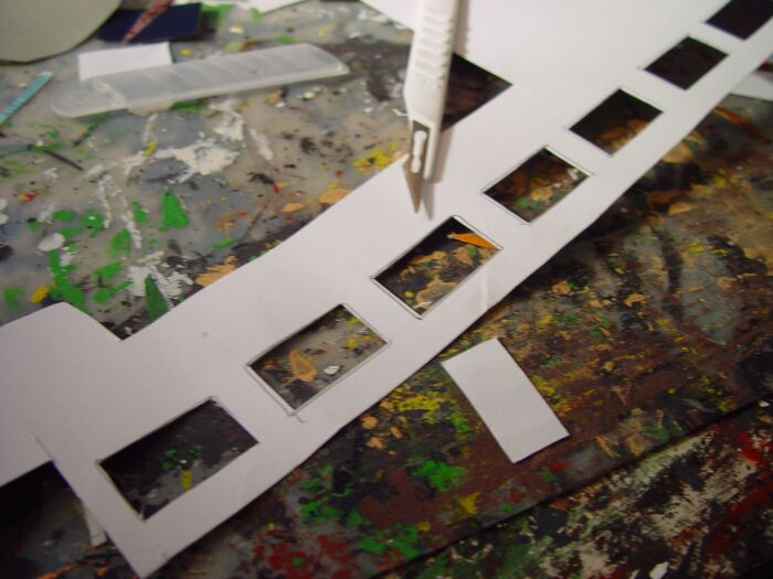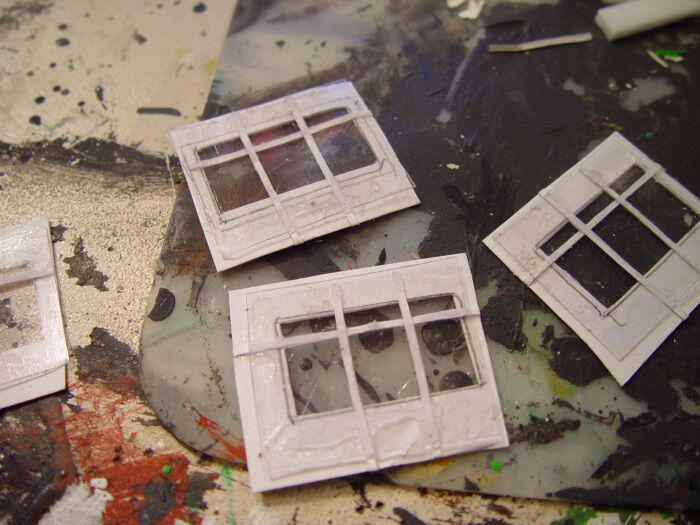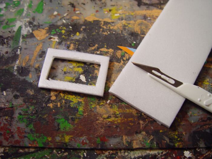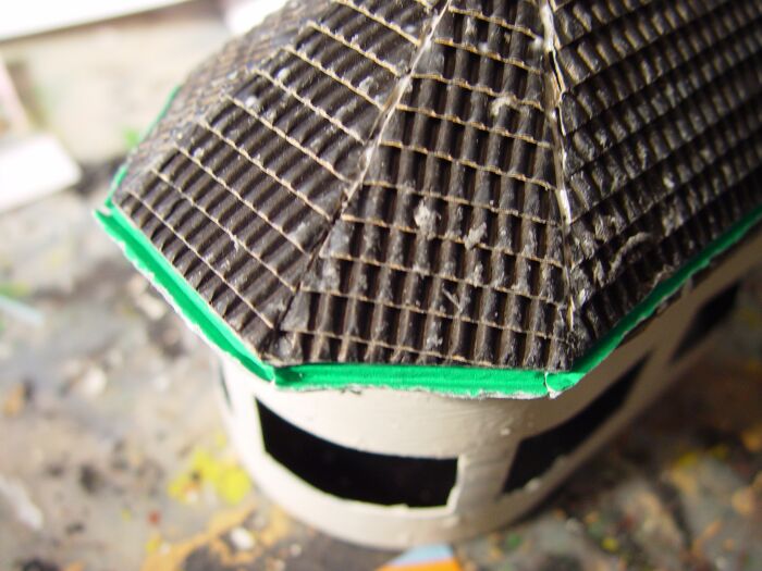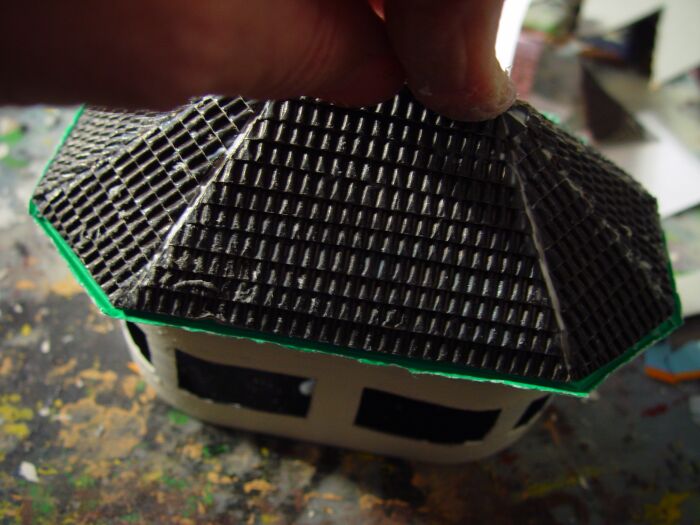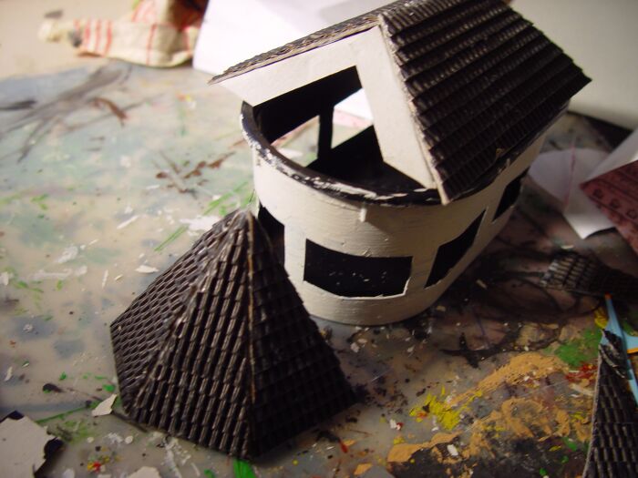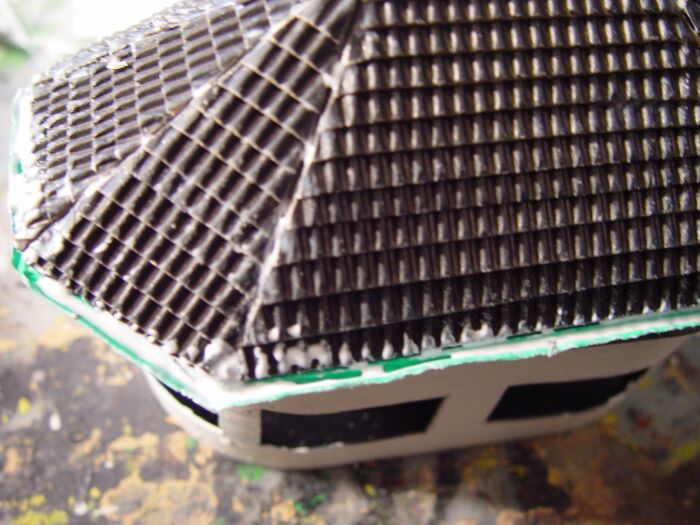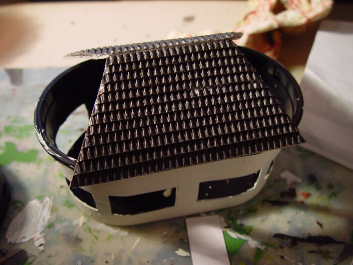Für den unteren Baukörper habe ich aus Pappe eine Quader zusammengeklebt und die Fenster- bzw. Türöffnungen mit Depron verstärkt:
