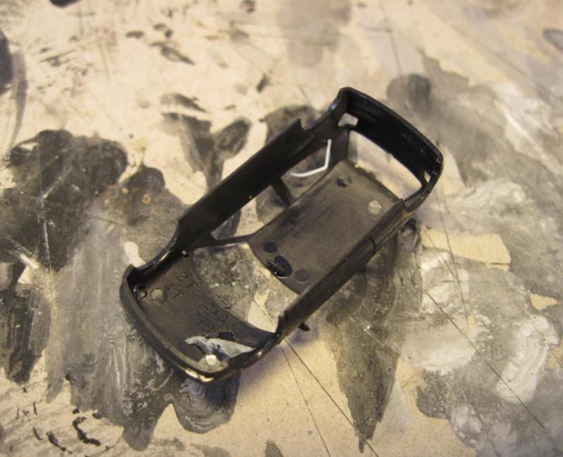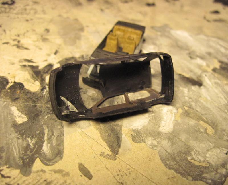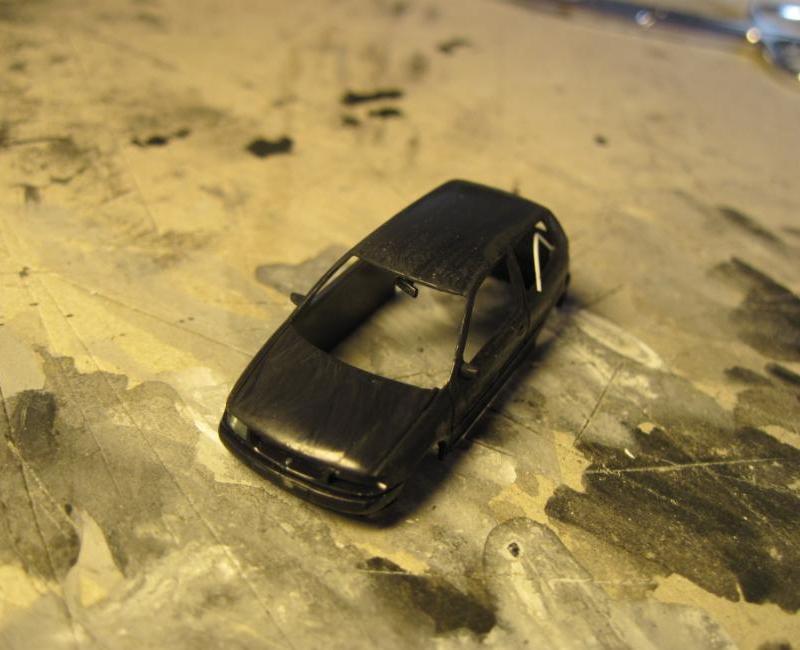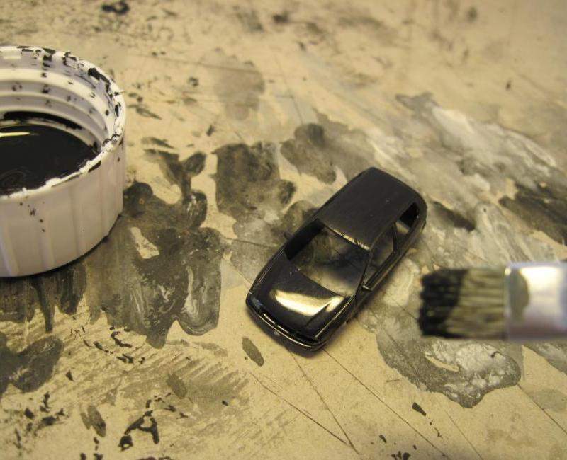 1) Los geht es mit dem Groben: will man Türen o.Ä. entfernen, schneidet man diese jetzt wahlweise mit einem Hobbymesser oder einer kleinen Schere (z.B. Nagelschere) raus. In diesem Fall mussten aber nur die Scheibenwischer dran glauben, also weiter gehts: das Modell wird in seine Einzelteile zerlegt, und matte schwarze Abtönfarbe kommt zum Einsatz. Die Karosse wird hiermit von Aussen nett bedeckt, und anschliessend sofort mit einem trockenen Küchentuch wieder verwischt. Das macht man am besten flächenweise, damit die Farbe es nicht zu trocknen schafft. Alleine diese Vorgehensweise ergibt schon diesen herrlichen verwitterten und kontrastierten Effekt auf der Karosse.