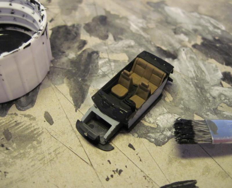 2) Weiter geht es mit der Inneneinrichtung. Da diese noch den Plastiklook hat, muss hier wieder die schwarze Abtönfarbe her. Alle später sichtbaren Flächen (ausser die Sitze!) werden deckend schwarz bemalt. Die Sitze bekommen eigens für den Kontrast einen anderen Anstrich: entschieden habe ich mich hier für ein freundliches Kackbraun.