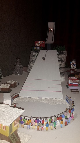 Nun ja, wenn es Massstabsgerecht wäre, und man alle Übergänge in Schnee verhüllen würde, dann würde es bestimmt ein stimmiges Diorama abgeben. Auch ist für mich nicht erkennbar, wie die Springer auf die Schanze kommen sollen.