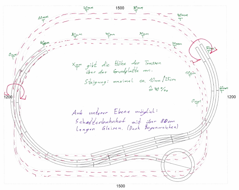 Die maximale Steigung ist wegen der kleinen Anlagenfläche natürlich relativ groß (in meinem Vorschlag ca. 40 Promille, dafür kriege ich jetzt vielleicht schon Haue...), aber da deine Züge eh nicht so lang sein können, sollte das gehen...