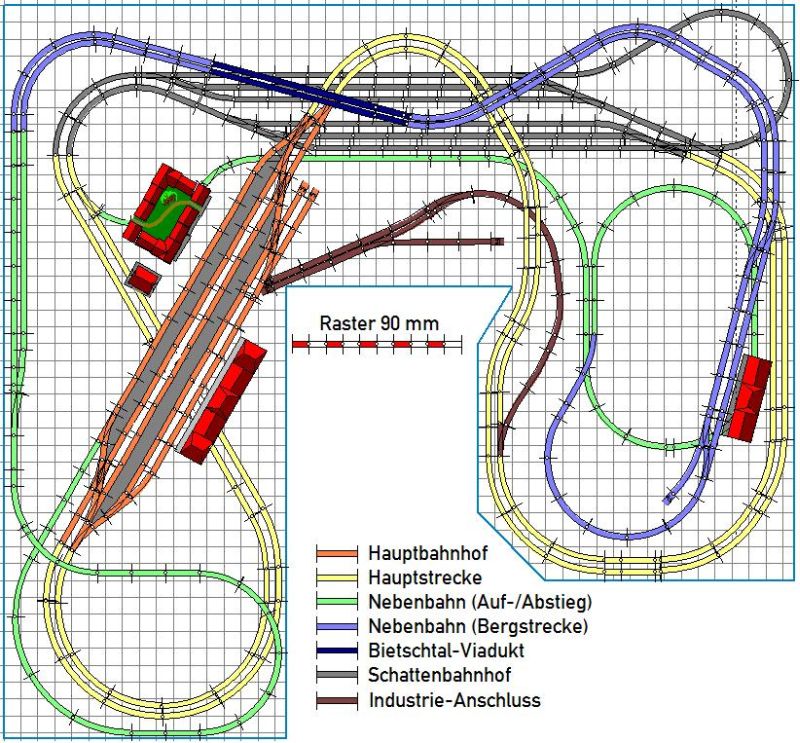 Schönheitsfehler: Die südliche Schleife im rechten Teil ragt über den Anlagenrand hinaus. Hier muss angepasst werden. Auch könnte der Berg über der Gleiswendel rechts recht steil ausfallen. Vielleicht sollte man einen Stausee mit Staumauer (und Wasserkraftwerk etc.) einplanen, um die steile Wand glaubhaft zu gestalten. Die Wendel ist übrigens in R1 angelegt, aber auch R2 sollte noch realisierbar sein.
