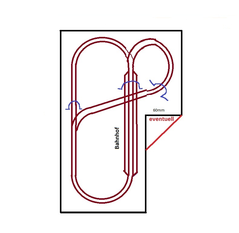 ) für eine Skizze verwendet und auf die schnelle zwei Bilder erstellt. Auf dem ersten siehst du meine geplante Anlage in den Ausmaßen, über ein paar cm hier und da könnte man noch verhandeln, viel größer darf sie aber eigentlich nicht werden. Eventuell könnte ich aber die rote Ecke noch nutzen.