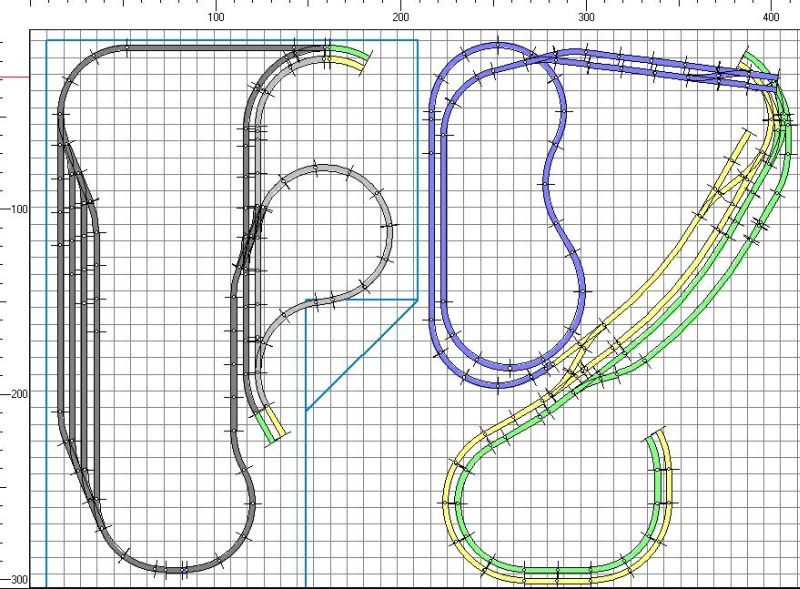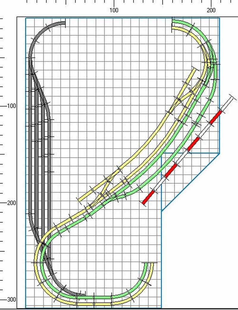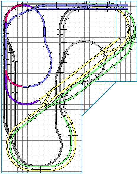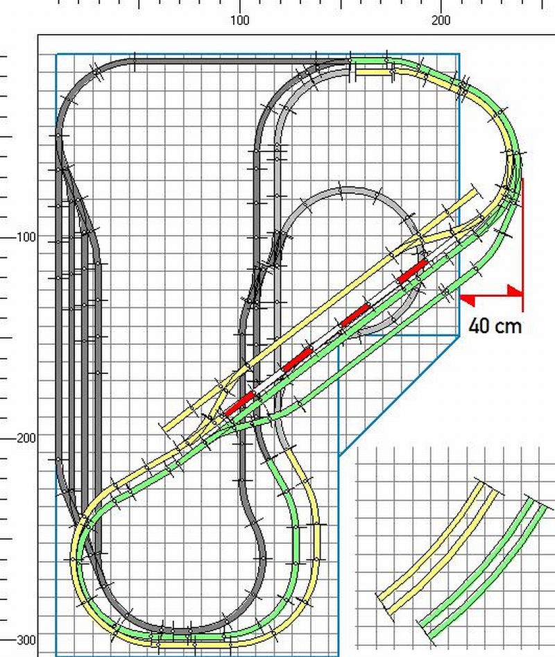 Verkehr auf der Hauptstrecke (geteilt in zwei Stromkreise, gelb u. grün) ist doppelt umkehrbar, also N --> S; N --> N; S --> N; S --> S.