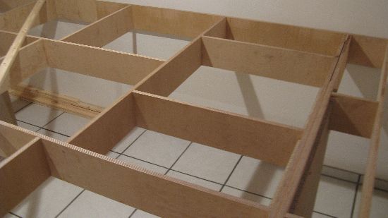 Als Spantenmaterial wurde Birkensperrholz (Multiplex-Platte) mit den Abmaßen 15 x 145mm verwendet. Die Spanten sind deshalb so hoch, da sie eine Spannweite von 1,82m zwischen den Stützen überbrücken müssen. Zusätzlich ragt der Rahmen ca. 50 cm nach vorne und nach hinten über die Stützung hinaus. Diese Maße wurden gewählt, damit genügend Bewegungsraum unterhalb der Anlage erhalten bleibt. Hier stören keine aussteifenden Diagonalen. Das mittlere Rastermaß von 61cm ist recht groß gewählt. Da jedoch die unterste Fahrtrasse ca. 5 cm oberhalb des Rahmens liegen soll, ist es ein leichtes die Fahrtrassen in einem kleineren Raster abzufangen. Das gleichmäßige Raster musste an einigen Stellen jedoch unterbrochen werden, um Zugänge zu den mittleren Anlagenteilen zu bekommen und um in die zukünftigen Gleiswendel hinein zugelangen.