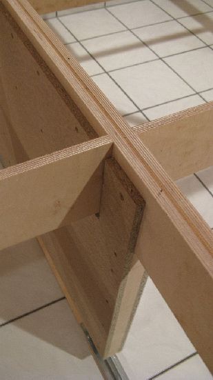 Die Spanten sind mit jeweils zwei Schrauben 4x70 und ordentlich viel Holzleim verbunden. Um Multiplexplatten so zu verschrauben benötigt man allerdings Spezialschrauben, die im Baumarkt nicht erhältlich sind. Diese haben eine Bohrspitze, die das Holz beim Eindrehen vorbohrt und somit verhindern, dass die Holzlagen auseinander reißen. Der Spaß ist recht teuer. Die Packung mit 200 Stück kostet ca. 30 € in der „Apotheke“.