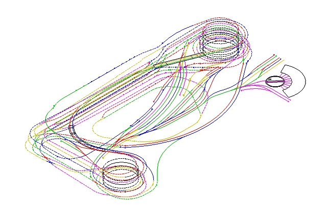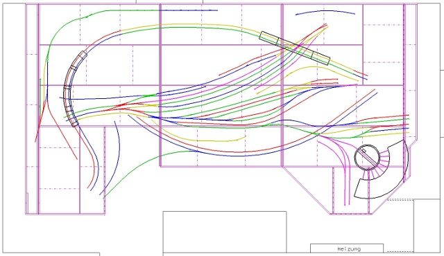 wie versprochen der Gleisplan, habe mir das Copyright besorgt. Der wurde mit einem CAD-Programm erstellt. Was auf dem Plan noch nicht stimmt ist das BW. Drehscheibe und Ringlokschuppen wurden nur provisorisch zur Größenermittlung eingezeichnet. Ich gehe mal ganz schwer davon aus, dass da noch was ganz anderes entstehen wird. Zur zeit ist mein guter Bekannter noch schwer mit der Planung im Bereich digitaler Steuerung und anderer kleiner Änderungen beschäftigt. Daher wird es in den nächsten Wochen hier keine weiteren vorzeigbaren Ergebnisse vom Aufbau mehr geben. Das Farbenchaos in den Gleisplänen hat übrigens nur etwas mit der Elektronik zu tun.