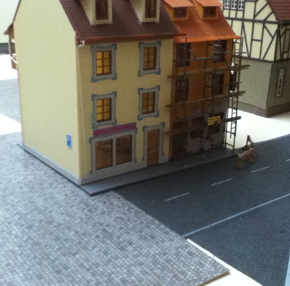 Zu dem anderen: Auf dem Boden ist bis jetzt nur die Straße festgeklebt. Ich werde um die Ecke herum weitere Gebäude machen sodass eine richtige Fußgängerzone entsteht. Ich habe nur keine Idee wie ich den Übergang von Asphalt in Kopfsteinpflaster machen soll.
