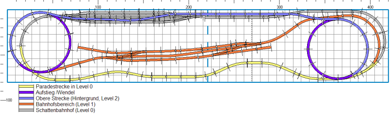 - Im Westen steigen die Strecken ja Zusammengefasst ab der Ebene Null (das wird wohl auf dem Anlagen-Brett sein) auf die Bahnhofsebene und von dort weiter über den teilweise offenen (tollen !) Wendel auf die Hochstrecke