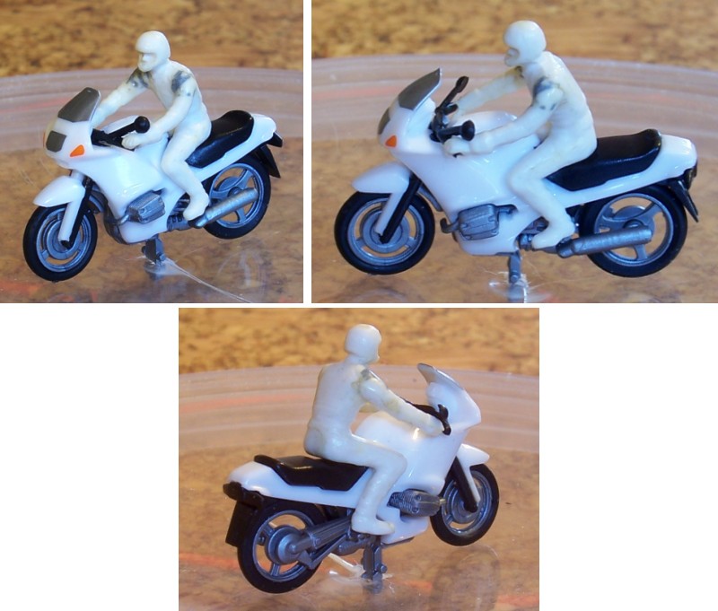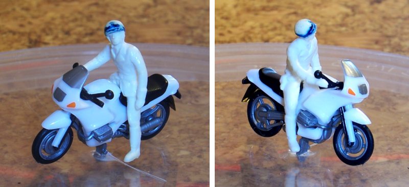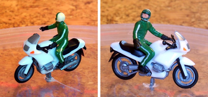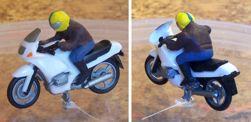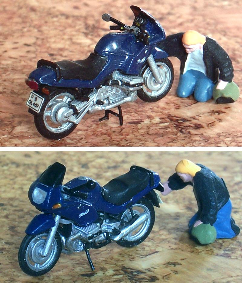 Ist jedenfalls etwas schwieriger als das Preiser-Motorrad - die Gummiräder bei Herpa erweisen sich als sehr unpraktisch.