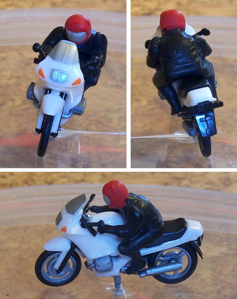 Wenn ich mal wieder viel Zeit für eigene Modelle habe, werde ich mir auch noch mal die Herpa-BMW vorknöpfen, dann auch mit Warnblinker und irgendwie die Ableitung der Kabel über das Hinterrad (denn ein fahrendes Motorrad mit ausgeklappten Ständer sieht nicht so prickelnd aus