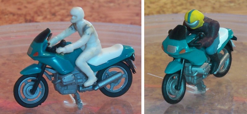 Bei der "fahrenden" Figur, die bereits einen fest angegossenen Lenker in den Händen hat, einfach den Lenker zwischen den Händen heraus trennen und die Hände ganz vorsichtig aufbohren (Durchmesser der Herpa-Lenkergriffe gibt den Bohrerdurchmesser vor, viel "Spielraum" gibt es da aber nicht, das wird sehr eng - zur Not also lieber so bohren, dass die "Fäuste" nach unten hin offen sind, das fällt dann nicht auf...).