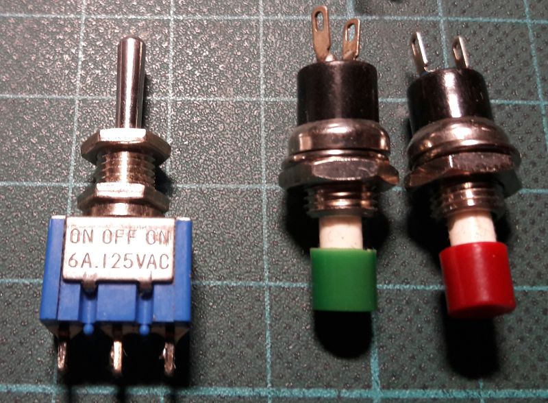 Links ist ein Kipphebel-Taster. Der rastet nicht ein, sondern gibt nur eine Impuls, solange man den Hebel festhält.