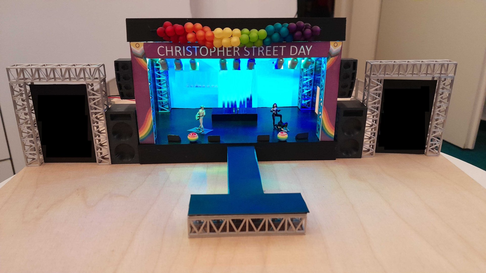 Somit stand das Grundgerüst, was ich mir in etwa gedacht habe. Ich habe dann überlegt, dass die Seiten der Bühne nicht offen bleiben sollen und habe dafür Kunststoff-Platten in Schwarz bestellt um die Verkleidung zu realisieren. Auch fand ich auf einer Messe/Ausstellung Rainbow-LED-Streifen, die nur noch an die Spannungsversorgung angeschlossen werden mussten.