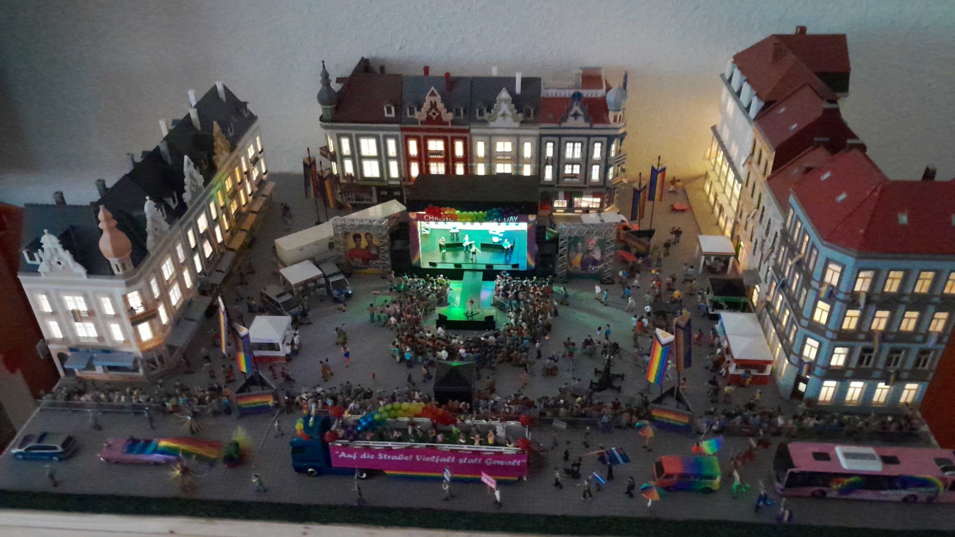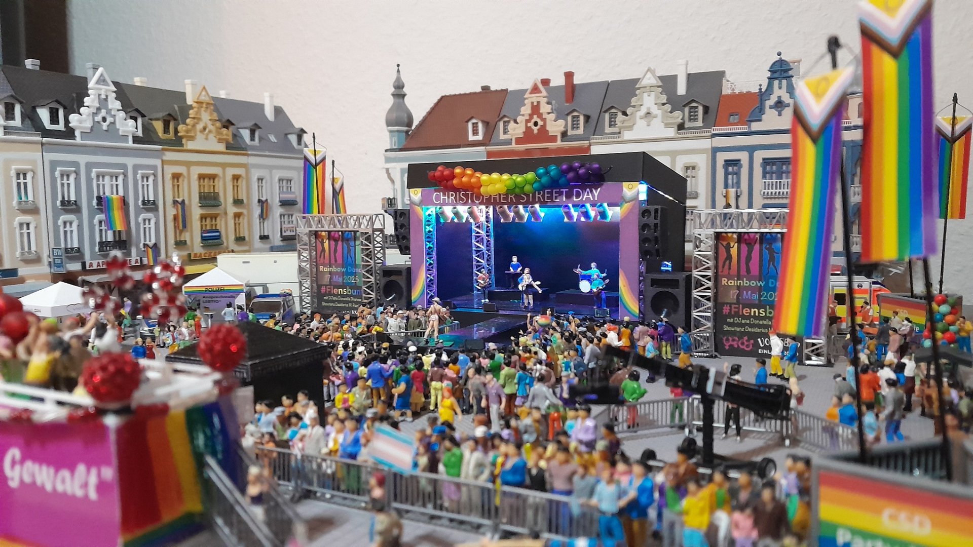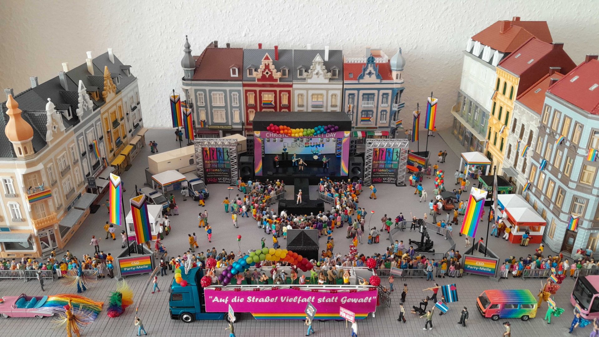 Nachdem ich mit meinem Ergebnis zufrieden war, wurde eine komplette Szenerie gestaltet. Ich habe einen Marktplatz gestaltet mit Häusern drum herum und einer Straße im vorderen Bereich. Das ganze wurde dann zu einem CSD-Straßenfest samt eines CSD-Umzugs ausgebaut.