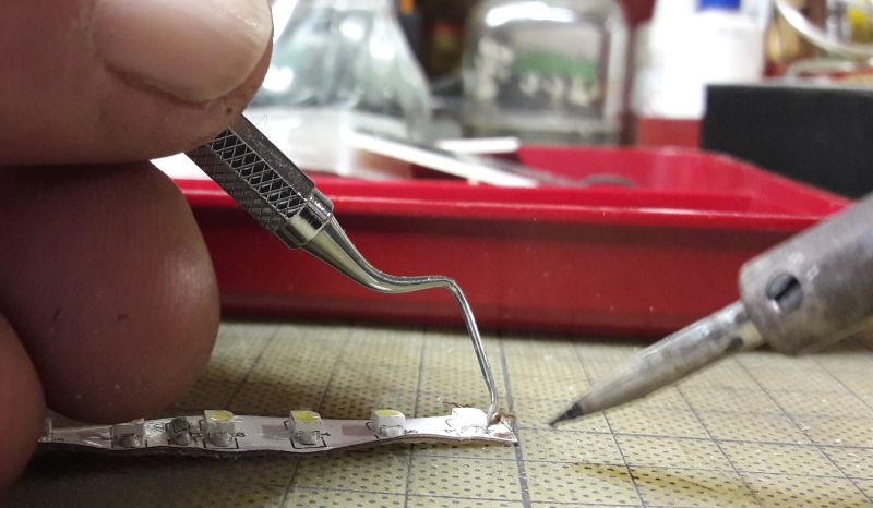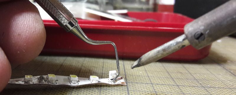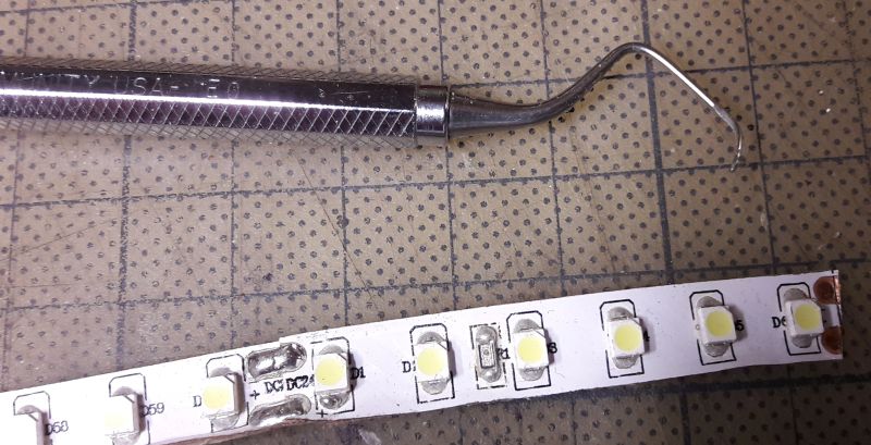 Neben einer tauglichen Lötstation, möglichst mit fein regelbarer Temperatur, benötigen wir zunächst nur einen spitzen Haken und natürlich das Bauteil mit den LEDs. Hier sehen wir eine Art zahnärztliches Instrument, das hinreichend spitz und geignet gekröpft ist. Als Beutegrund dient ein Rest-Stück LED-Strip, wie er im Möbel- und Vitrinenbau verwendet wird. Ein wenig gelenkig sollten die Finger schon sein, vor allem wenn man mit einer HAnd den Haken, mit der Zweiten den Strip, mit der Dritten den Lötkolben und mit der Vierten die Kamera hält. Im Ernst: in Bleisitft-Haltung das Hakenwerkzeug, mit dem Ringfinger den Strip fixieren, kurz (unter 1 sec) mit der 400° heißen Lötpitze an die LED, und schon... ...klappt sie nach oben. Das wiederholen wir 5 mal, drehen den Strip um und greifen nun die erste LED mit der Pinzette. Den Strip mit dem Ringfinger niederhalten. Wieder kurz anheizen, LED weglegen; anheizen, weglegen; usw. Hier bleiben 6 LEDs neben dem leergedroschenen Strip-Gerippe.