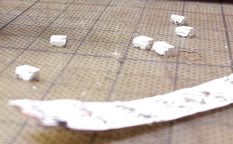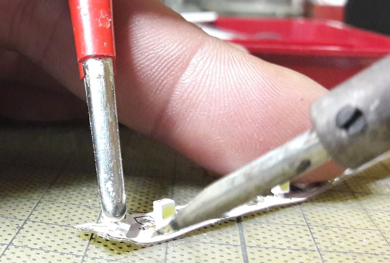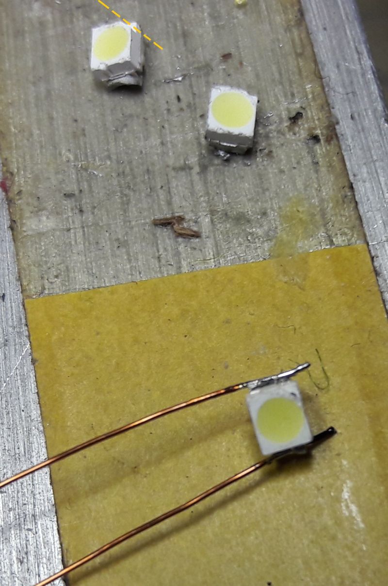 An die Enden der Drähtchen führen wir den extra heißen Lötkolben (um 450 °) und stippen in einen Tropfen frischen Lötzinns ein. Die Lackschicht sollte kurz aufblubbern, zischen, und dann von einem sauberen Zinnüberzug ersetzt worden sein. Zinn öfters abstreifen und eine frische "Perle" auf der Kolbenspitze erzeugen. Hier blinkt uns eines der frisch verzinnten Drahtenden gerade an. Die vorhin geernteten LEDs kommen nun auf den Klebefilm. Ich lege sie mir immer so treppchenartig hin, damit ich an beide Seiten gut herankomme. Außerdem achte ich darauf, das alle LEDs in gleicher Pol-Ausrichtung liegen. Bei dieser Bauart (könnte 1211 heißen, sind jedenfalls etwa 3,05 x 2,75 mm groß) ist die Minusseite durch eine abgeschrägte Ecke gekennzeichnet. Hält man nun den eben verzinnten Draht an eines der LED-Pads, braucht es bei rund 400° keine Sekunde, um das Lot zum Fließen und eine Verbindung zu Stande zu bringen. Wenn ich die Polung beachtet habe, weiß ich nachher bei den fertig bedrahteten LEDs immer sofort, welcher der Minus-Draht ist. Zweiter Draht dran, die eventuell überstehenden Enden noch mit dem feinen Seitenschneider beifrisieren. Zum Prüfen nehme ich immer eine gebrauchte Knopfzelle von 3 V. LED i. O.? Dann ab in den Vorrat. Okay, die 1211er sind ziemliche Klötze, keine Kunst höre ich da aus den hinteren Reihen. Stimmt ja, die Bauart ist schon fast zu groß, um in H0 besipielsweise als Autoscheinwerfer "Ford Granada" oder "Opel Rekord" durchzugehen. Aber für die Ausleuchtung von Gebäuden sehr zu gebrauchen.