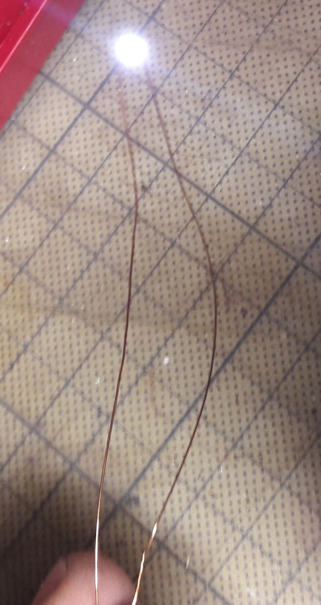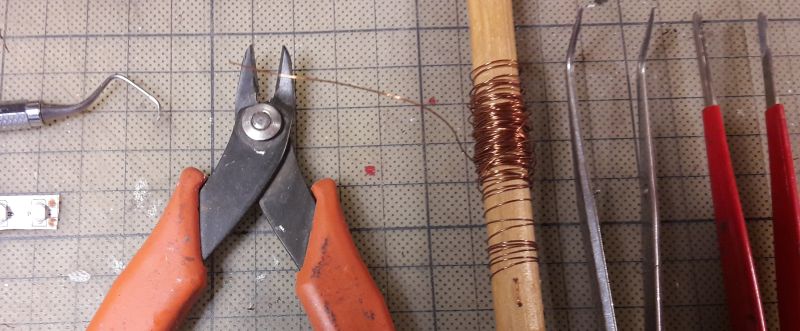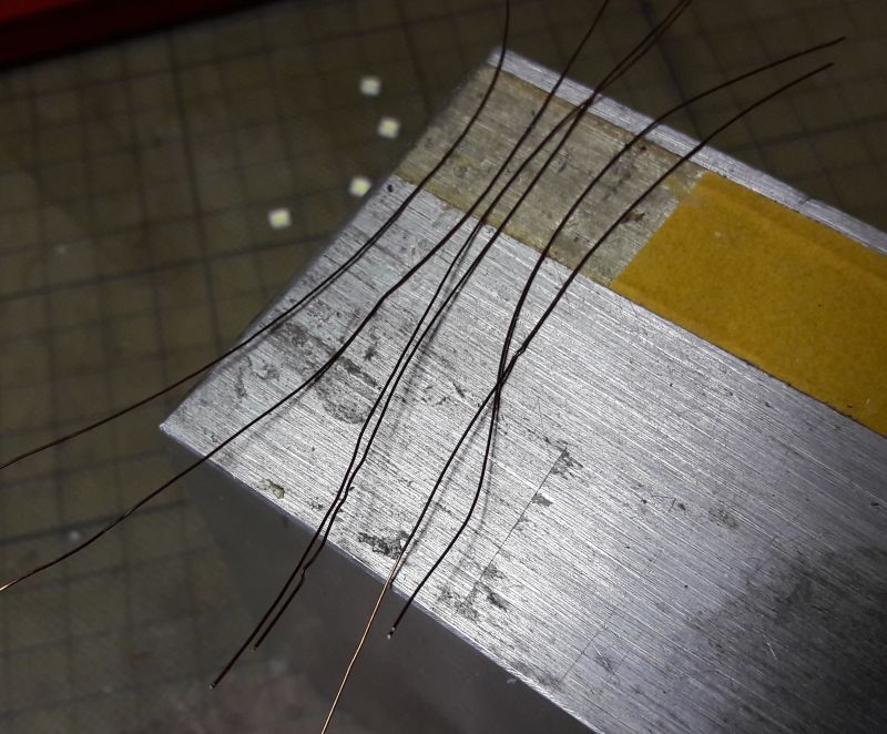 Womit wir wieder im Thema wären. Ein Teil der Oberseite ist mit doppeltem Klebefilm belegt. Bei Nichtgebrauch zum Schutz vor Staub kleben wir das Silikonpapier einfach wieder drauf. (Wenn es denn gar zu verkrümelt ist, einfach ein neues Stück aufbringen.) Jetzt legen wir ein Stückchen Klebefläche frei, auf der wir die ersten 6 Stückchen Lackdraht plazieren. Denn Lackdraht lässt sich wegen des Lacküberzuges nicht löten. Also muss der Lack ab.