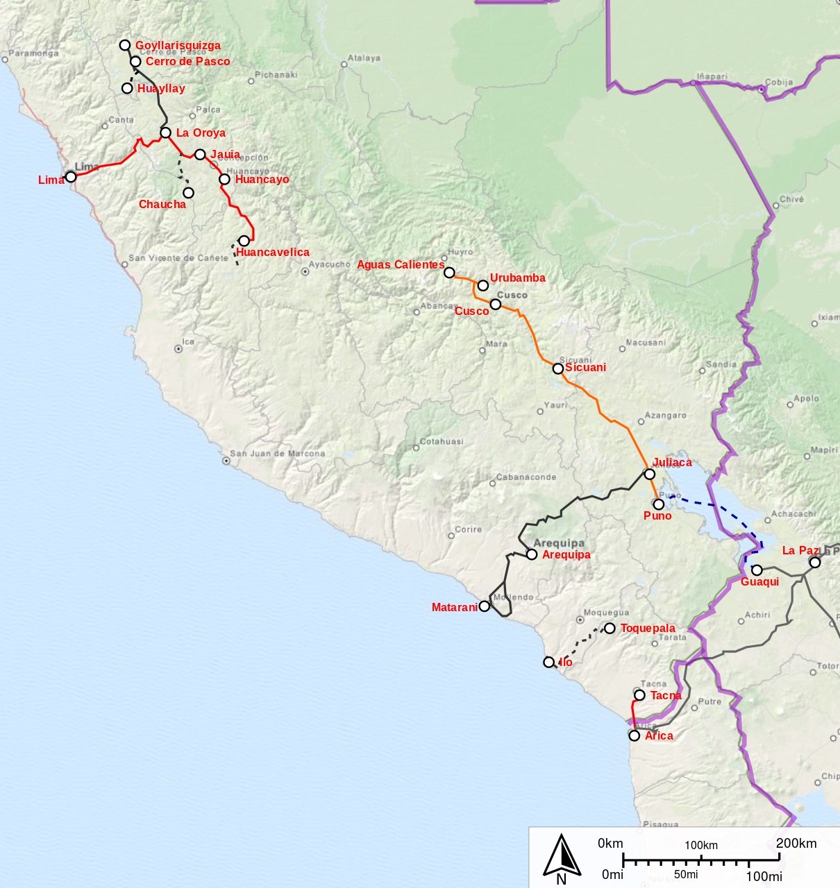 Die peruanische Eisenbahn zwischen Huancayo und Lima ist fantastisch! Sie ist die höchste des Kontinents. Die Viadukte und Tunnels sind wunderschön.