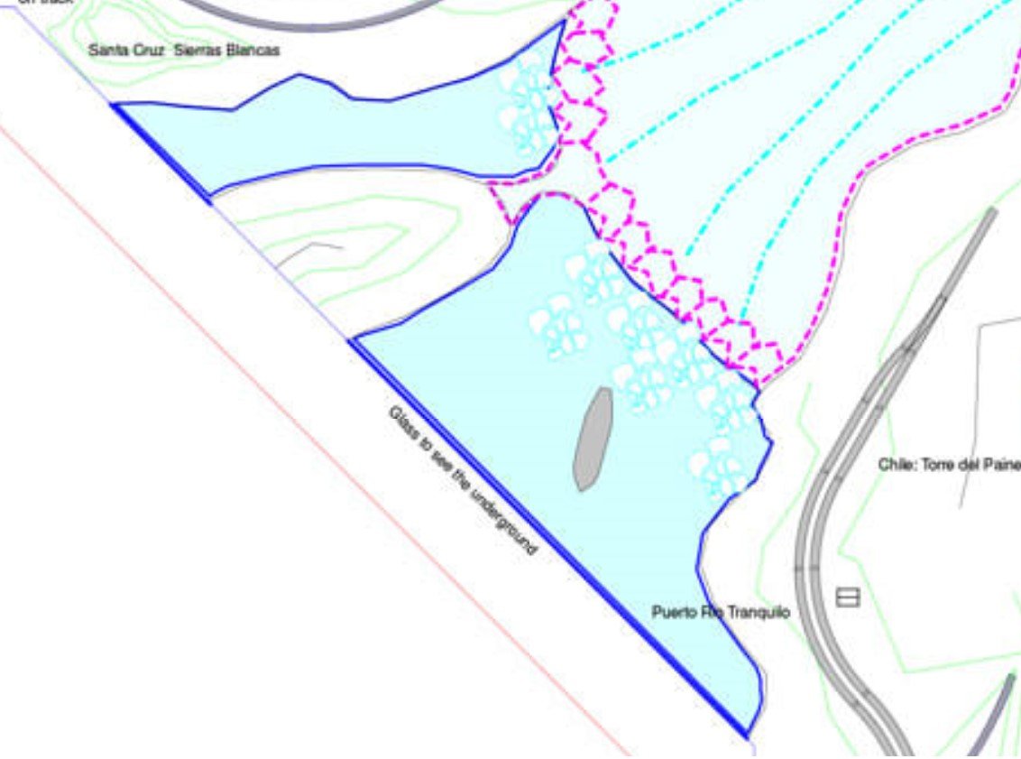 Der Übergang zwischen Argentinien und Chile wird durch den Gletscher "Perito Moreno" geprägt, der in einem Wasserbecken enden soll und dort kalbt. Das Becken selbst endet lt. Plan an der Anlagenkante mit einer großen Glasscheibe. _