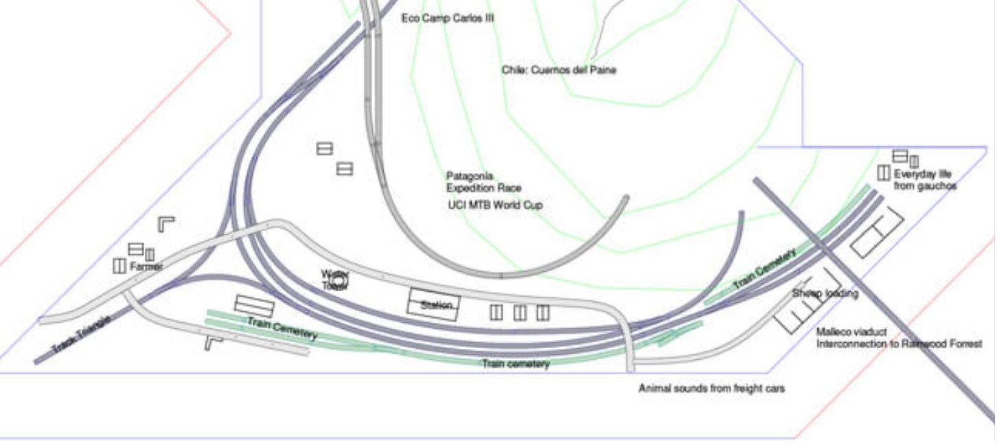 Auf der chilenischen Seite endet die Schmalspuranlage in einem weiteren Bahnhof mit Wasserturm, Schafsverladung und Friedhofsgleisen (wenn da mal nicht doch die Bahnabteilung dahinter steckt). Zum wenden von Dampfloks ist ein Gleisdreieck vorgesehen. Sehr interessant sieht der Anschluss an den "Regenwald Abschnitt" aus, der über das Malleco Vadukt erfolgt. Ob es dort später mal über die Köpfe der Zuschauer hinweg geht? Das würde zumindest auf sehr hohe Berge hindeuten. _
