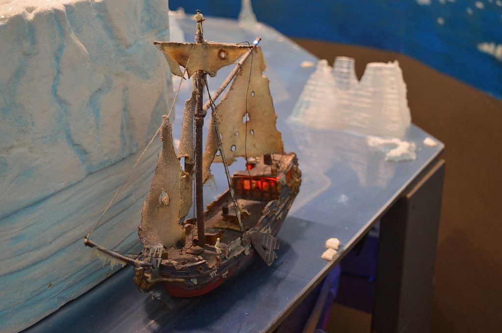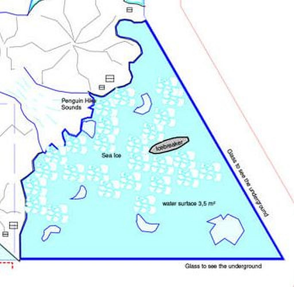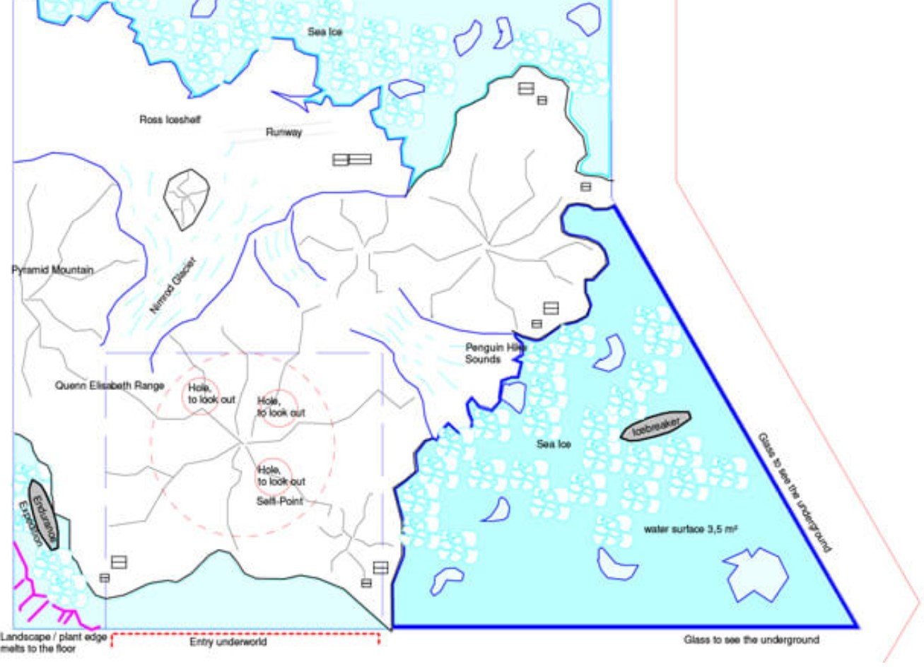 Am Rande des Rossschelfeises liegt eine Landebahn. Bei den eingezeichneten Gebäuden könnte es sich um Forschungsstationen handeln. Vielleicht werden ja auch einige "historische" Expeditionen dargestellt? Die "Endurance" ist jedenfalls links unten im Plan schon eingezeichnet. Direkt davor soll das antarktische Eis anscheinend bis zum Fußboden "schmelzen" (?).