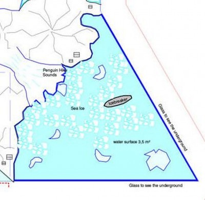 Interessant ist auch der eingezeichnete Eingang in die "Unterwelt", anscheinend mit Ausguckslöchern, durch die Besucher dann mitten in der Eislandschaft "auftauchen" können.
