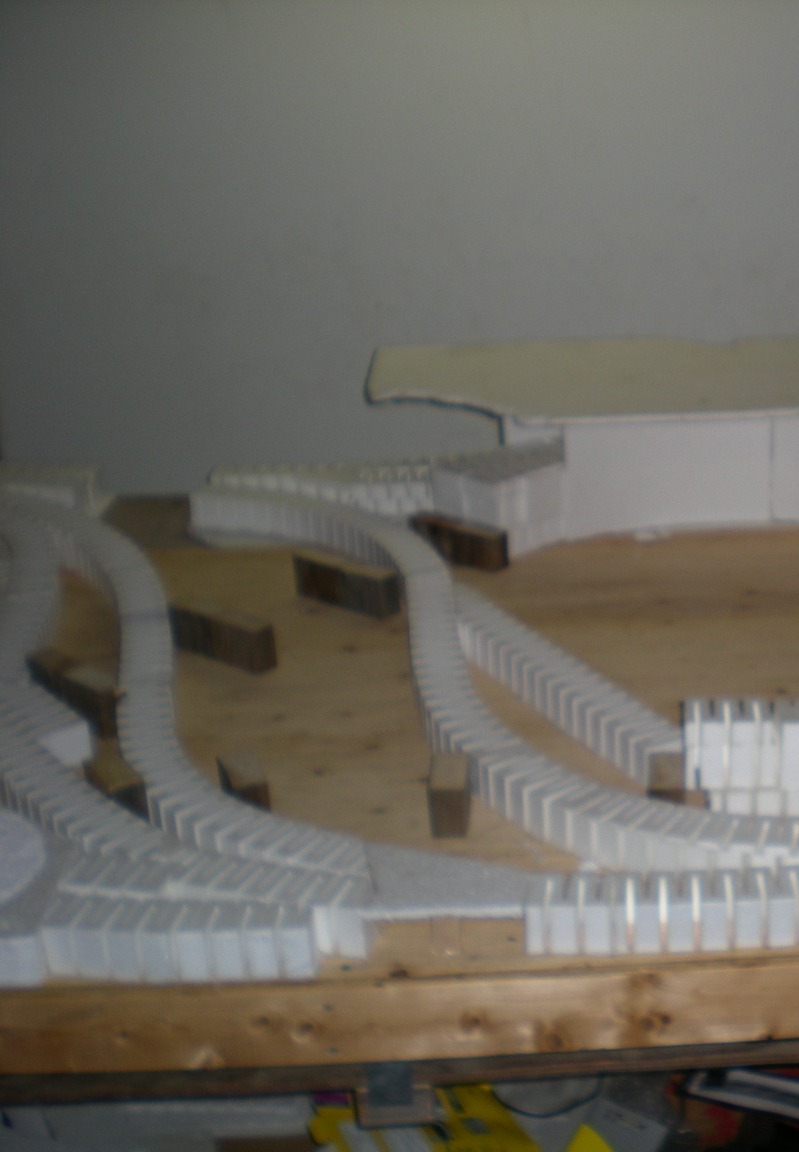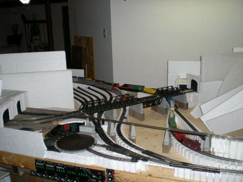My intent was for there to be a small pump that would pour water in underneath the foam bridge section at the foreground of the pictures I posted, and for that water to drain towards the background, and fall over the edge of the layout into a bucket, from which it would circulate back to the pump.