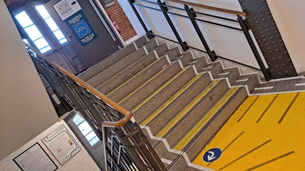 This is me arriving. I always feel so happy as I arrive at the top of these stairs. I thought the floor stickers were an excellent idea and really seemed to work. I noticed at several times they were busy fixing and replacing these stickers.