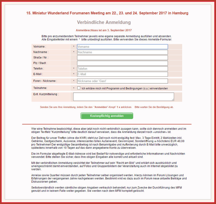 Bitte lest Euch das Kleingedruckte auf dem Anmeldeformular gut durch und meldet Euch trotzdem an. Bitte benutzt hierzu ausschließlich das Formular, Ihr erleichtert uns damit die Arbeit.