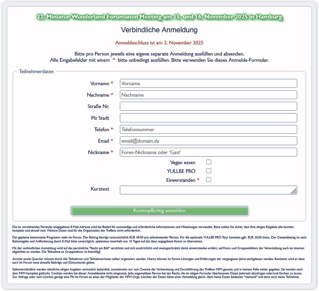 MFM möglich. Bitte lest Euch das Kleingedruckte auf dem Anmeldeformular gut durch und meldet Euch trotzdem an. Bitte benutzt hierzu ausschließlich das Formular, Ihr erleichtert uns damit die Arbeit.