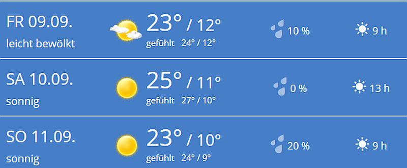 Die Zuverlässigkeit der Wettervorhersagen nimmt jenseits der zwei Tage leider rapide ab; letzten Montag z.B. war die Rede von wolkenlosen 30°C an diesem Wochenende, das tatsächliche Wetter wich nicht ganz unerheblich ab (20°C mit Regenschauern und zeitweisen Auflockerungen).