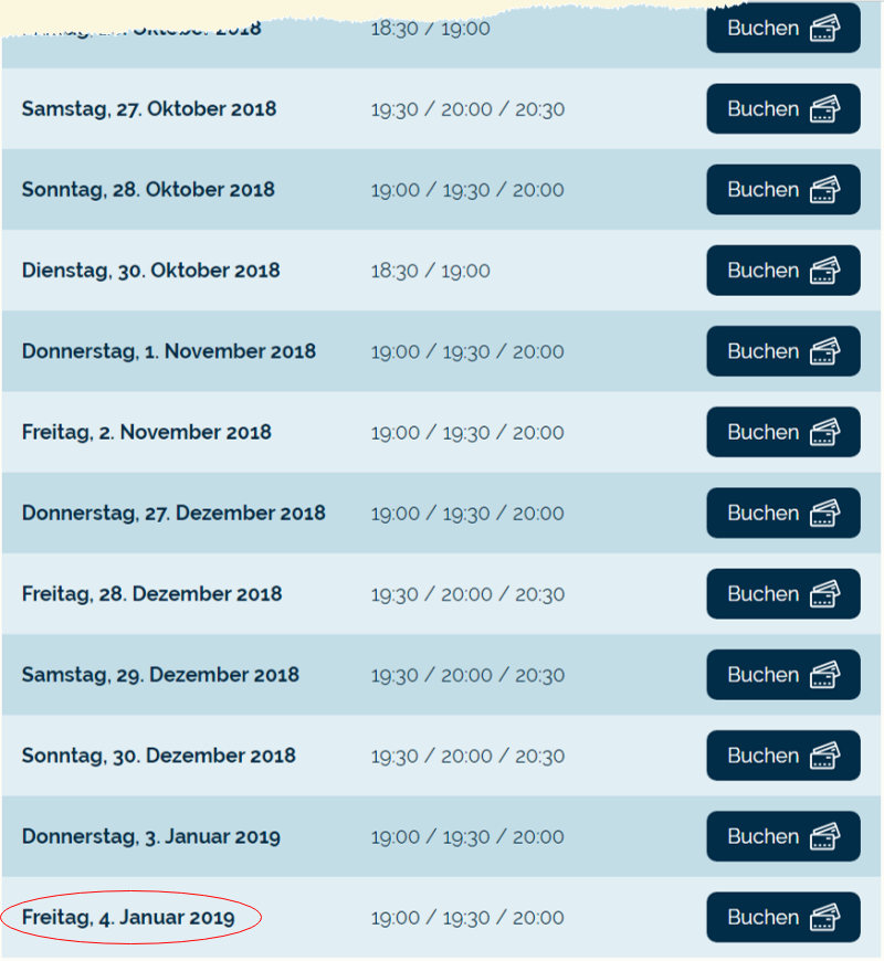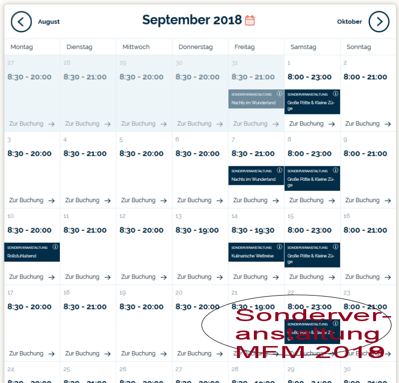 Zitat: "Die Termine für unsere Sonderveranstaltungen werden immer ca. sechs Monate im Voraus zur Buchung freigeschaltet."
