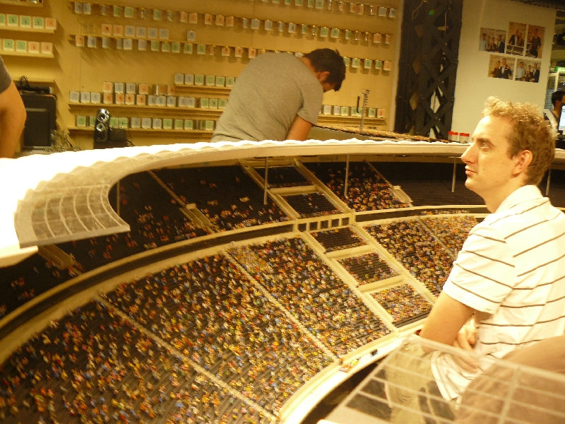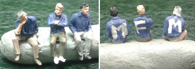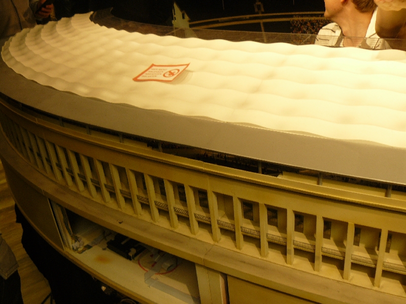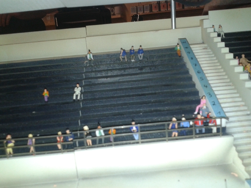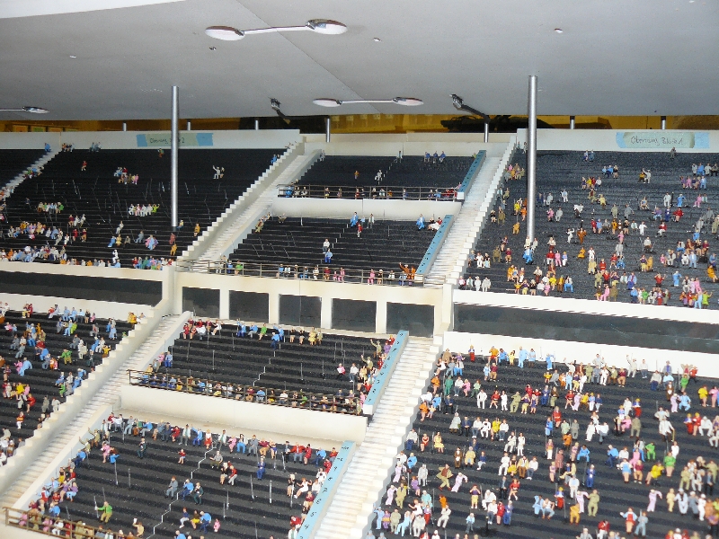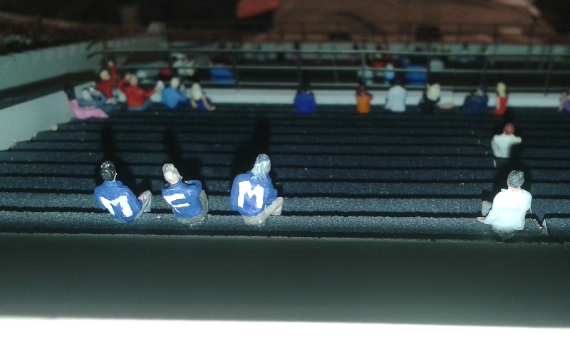 Zwecks Weiterverarbeitung werden unsere drei Stellvertreter "Dem Schuh" übergeben. "Der Schuh" (rechts im Bild) arbeitet im MiWuLa als Alleskleber. Der stark umrandete Teil vor dem Schuh ist die Ehrentribüne. Diese hat den Vorteil,... ... dass sie hinten oben offen ist. Da kann man durchgucken. Also wählte ich für uns die letzte, oberste Reihe und erteilte dem Schuh entsprechend Anweisung, der er nur all zu nachkam.Da müssen wir mit der Kamera etwas näher rangehen. Gut zu erkennen: die Schnittlinie links von unserer Truppe. Das Stadion kann nämlich halbiert werden, um auf seiner kommenden Tournee auch bei beengten Platzverhältnissen ausgestellt werden zu können. Durch unsere Position rechts vom Schnitt, als Bühenenseits, ist gewährleistet, dass wir IMMER mitereisen und auf jeder Ausstellung dabei sind. Und so sieht man die Brüder durch das o. erwähnte Guckloch. Gruß